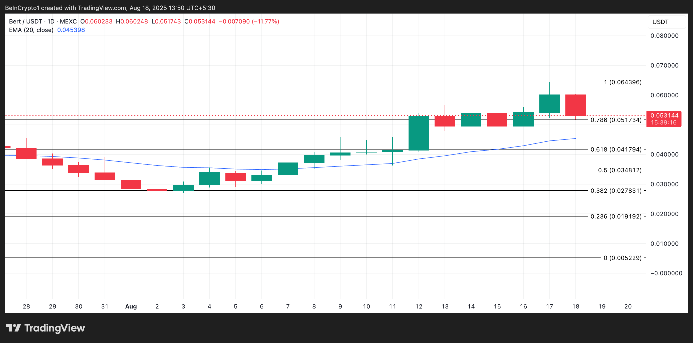Når et aktivs kurs handler over dets 20-dages EMA, er den kortsigtede trend bullish. At være over denne linje betyder, at det nylige købspres er stærkt nok til at holde BERT’s kurs højere end gennemsnittet for de sidste 20 dage.