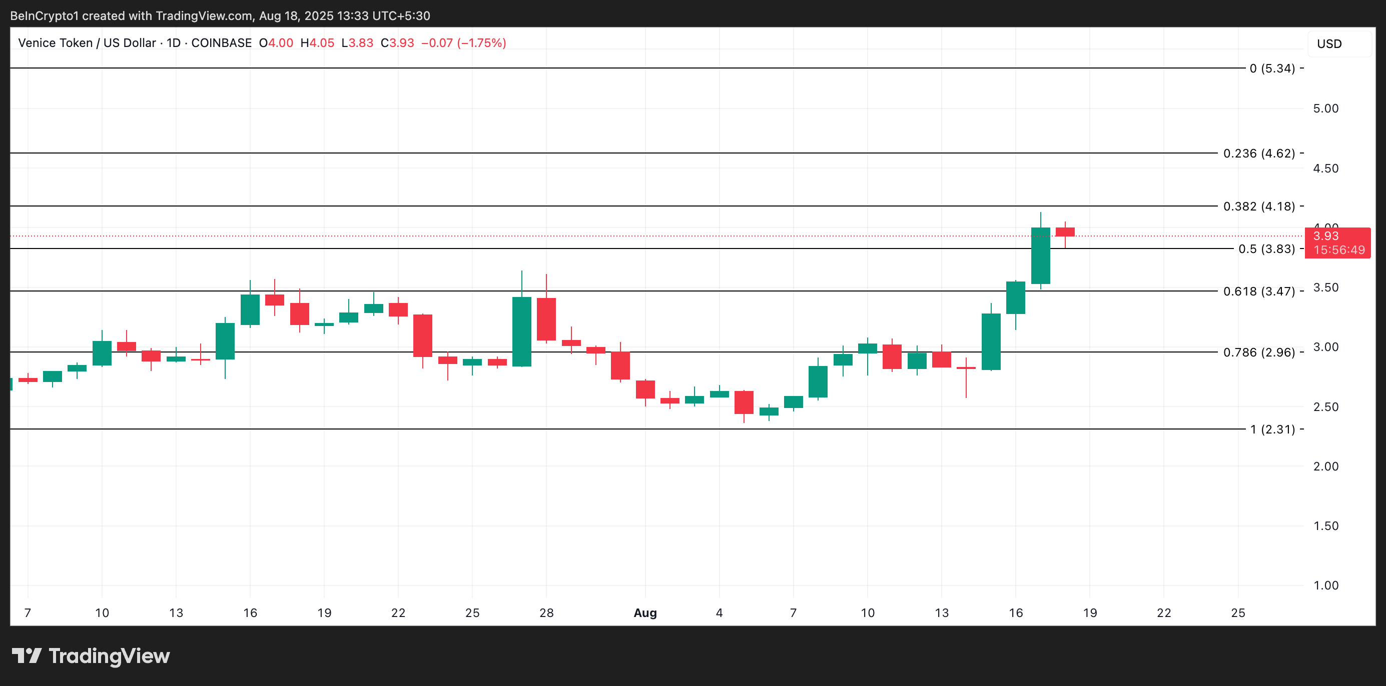 AI-drevne VVV er en anden Made in USA altcoin at holde øje med denne uge. Med en kurs på $3,93 i skrivende stund er VVV oppe med 34% i de seneste syv dage.
