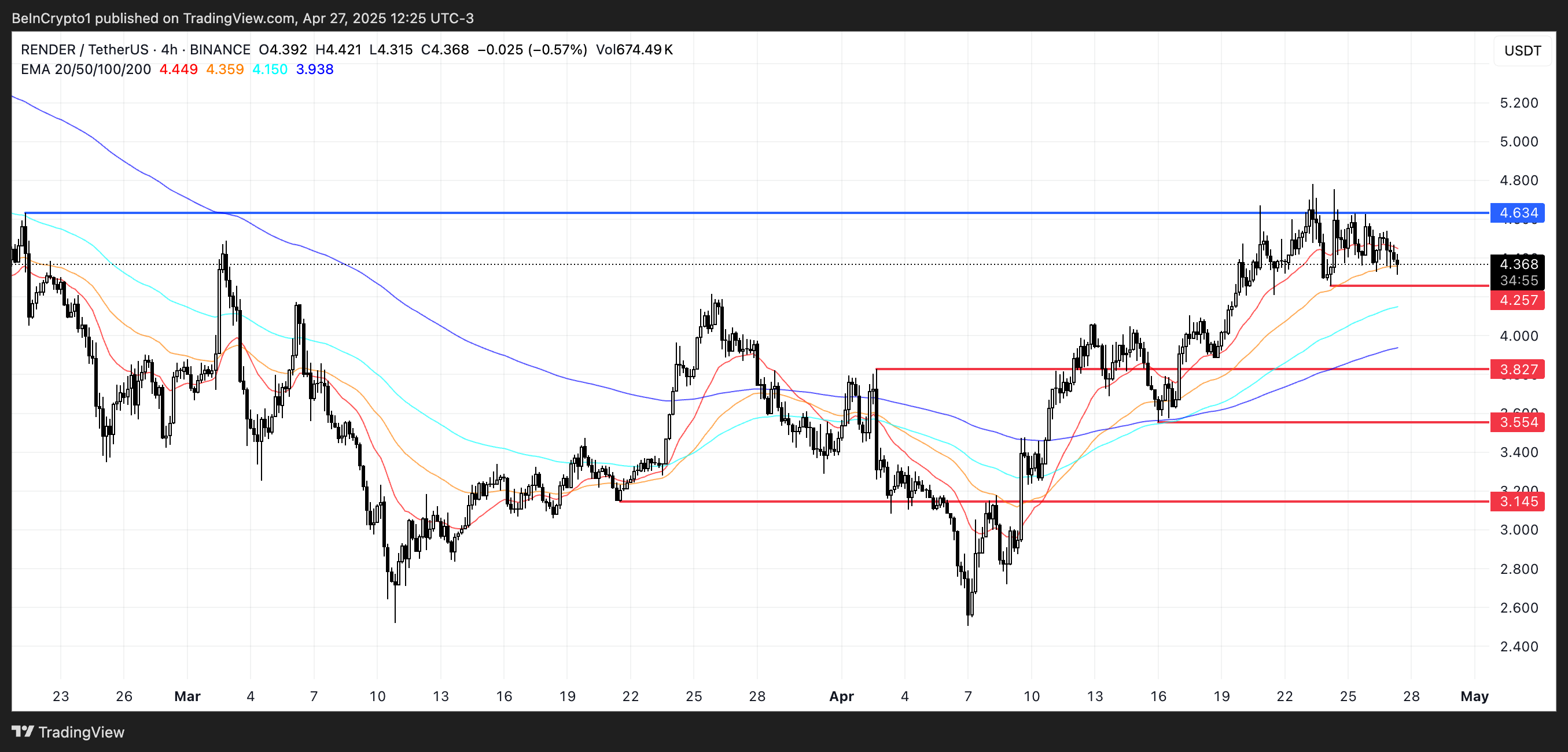 Hvis nedadgående trend materialiserer sig, kan RENDER først teste støtten ved $4,25; at miste det niveau kan åbne døren for dybere fald til $3,82, $3,55 og endda $3,14.