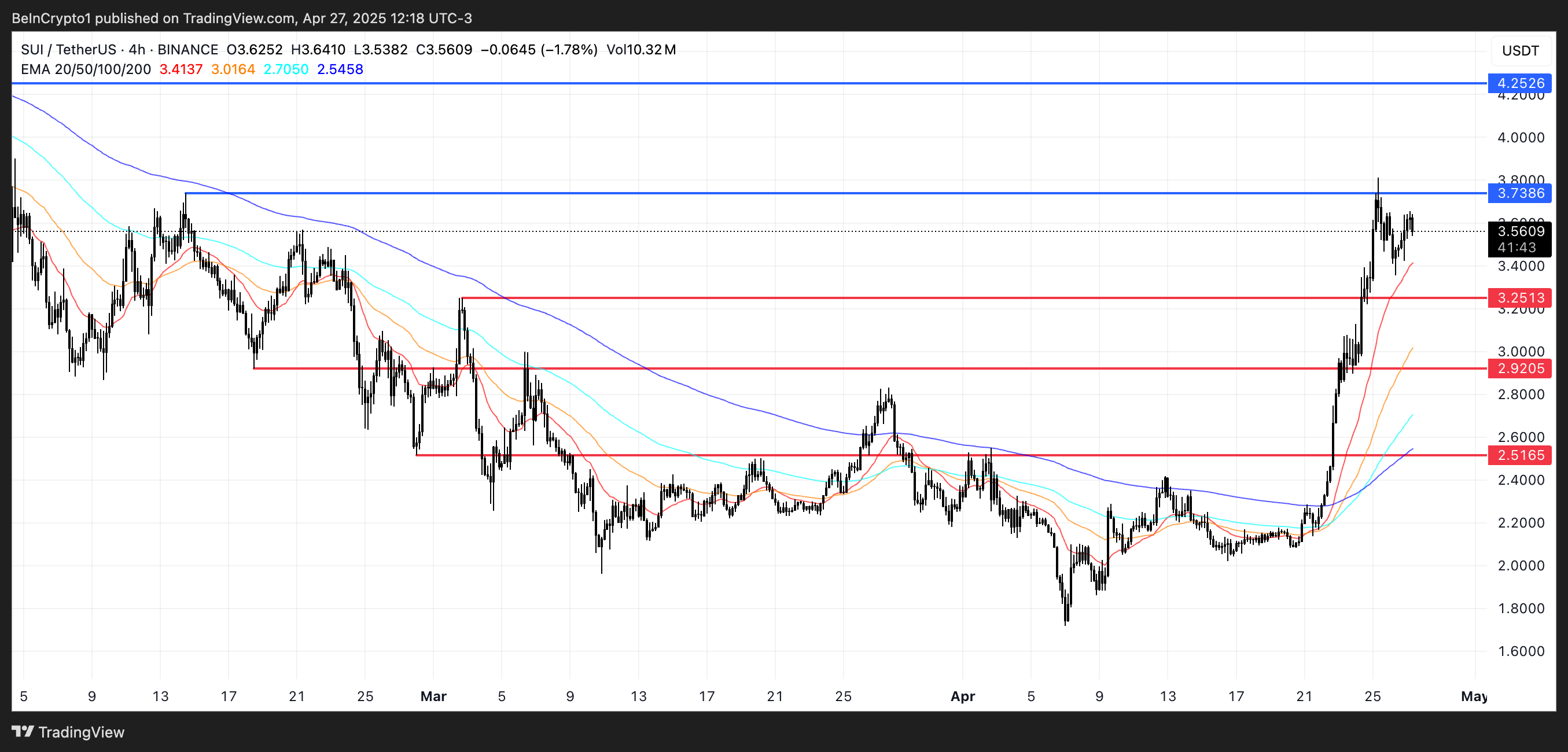 For nylig testede SUI modstanden ved $3,73, men formåede ikke at bryde igennem. Hvis det lykkes at teste dette niveau igen og bryde over det, vil det næste mål være $4,25, hvilket også vil markere SUIs første gang over $4 siden den 31. januar.