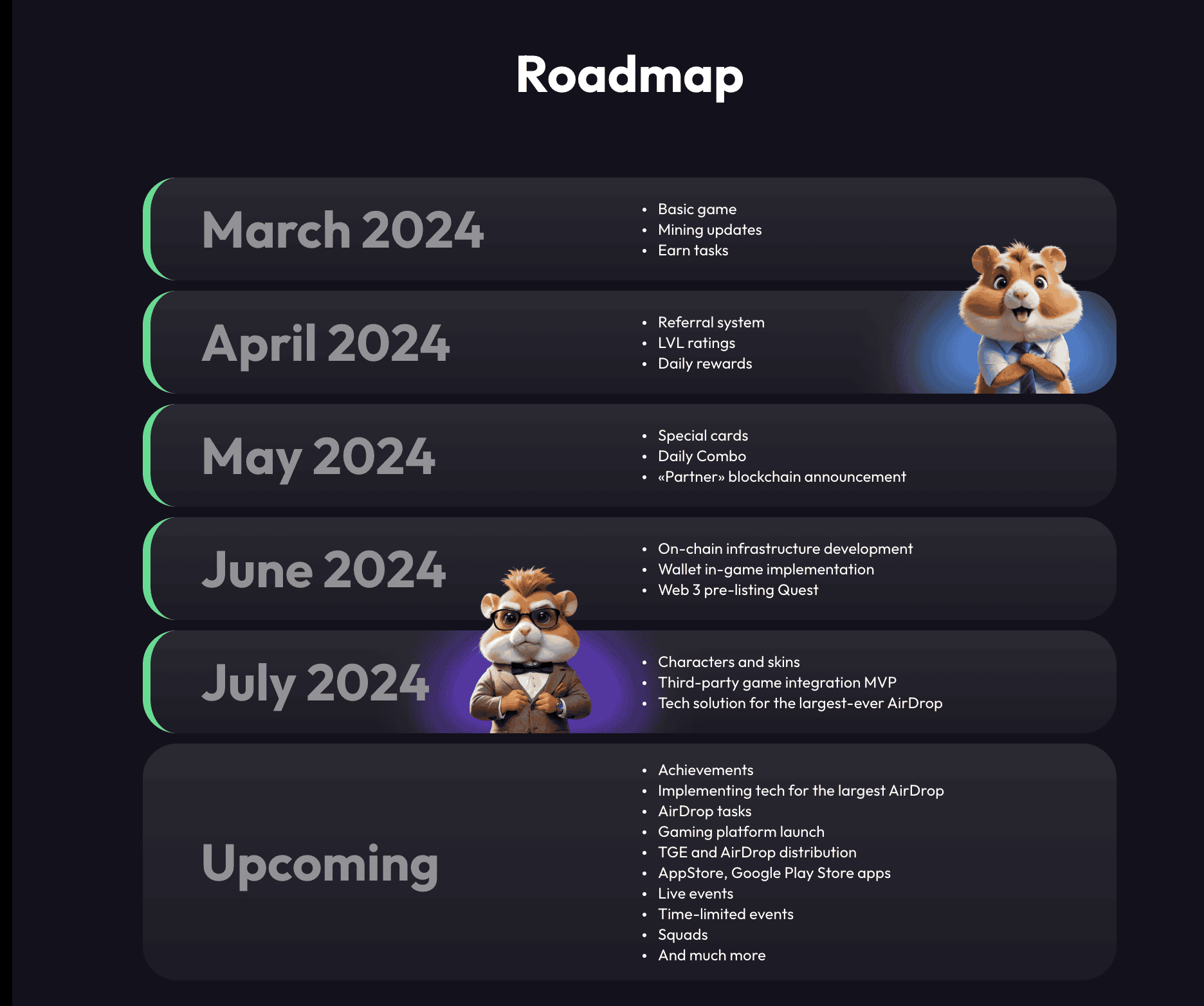 – En Token Generation Event (TGE) og airdrop af HMSTR-tokens i spillet er undervejs. Datoen er ubekræftet efter en forsinkelse, der blev annonceret af projektteamet i slutningen af juli 2024.