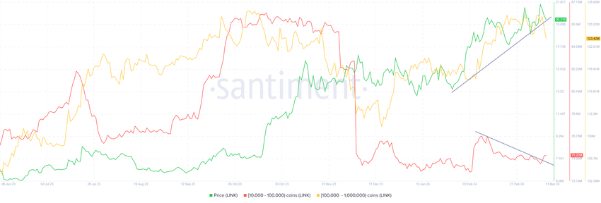 Som det ser ud nu, er der sandsynligvis et fald på vej, og investorernes adfærd kan være den samme. Især hvalinvestorer har signaleret en nedadgående tendens i nogen tid nu. Adresser med mellem 10.000 og 100.000 LINK har konsekvent solgt siden begyndelsen af februar. På halvanden måned er deres udbud faldet med næsten 2 millioner LINK til en værdi af over 40 millioner dollars.