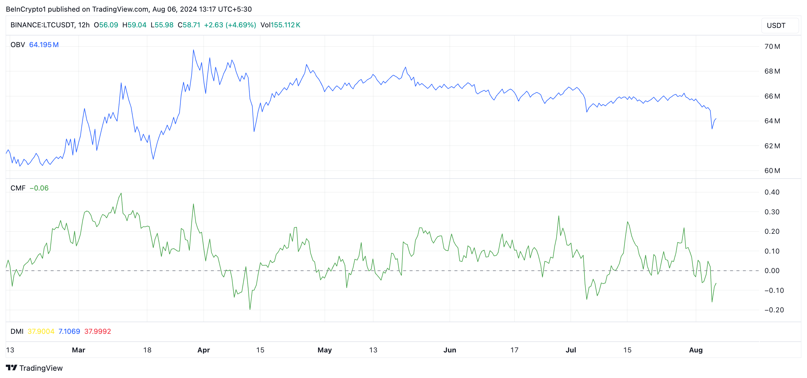 Yderligere viser aflæsninger fra LTC’s Directional Movement Index (DMI) at dens positive retningindikator (+DI) (blå) ligger under dens negative retningindikator (-DI) (rød).