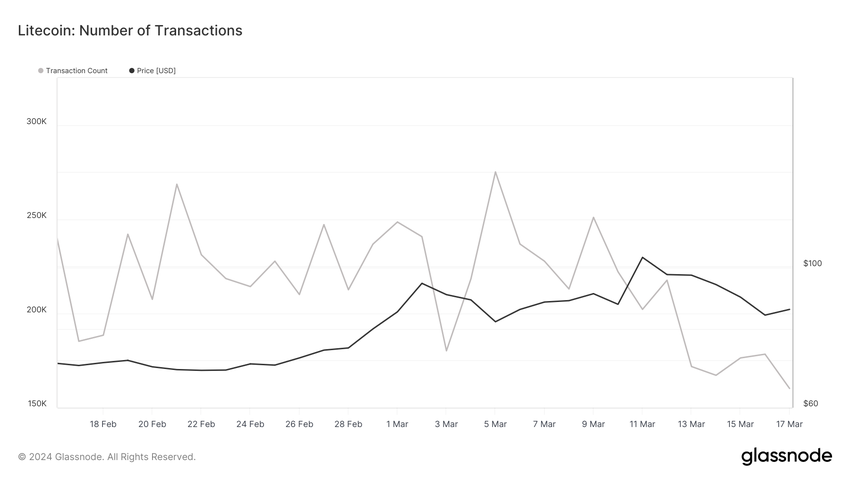I slutningen af januar begyndte tingene at ændre sig. Siden den 25. januar har Litecoin ikke registreret en eneste dag med mere end 400.000 transaktioner. Faktisk nåede den knap nok 300.000 i februar 2024. Det tal fortsatte med at falde i marts til mindre end 175.000 daglige transaktioner. På trods af det så vi en nylig prisstigning, og på samme tid faldt antallet af transaktioner.