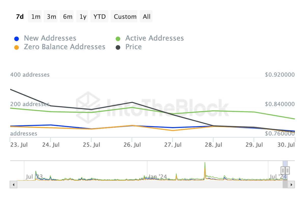 Som vist ovenfor er aktive, nye og nul-saldo-adresser på Mantle alle faldet i de sidste syv dage, hvilket afspejler et fald i interaktionen med MNT-tokenet. Skulle dette fortsætte, kan MNTs kurs finde det udfordrende at komme sig efter de seneste lavpunkter.