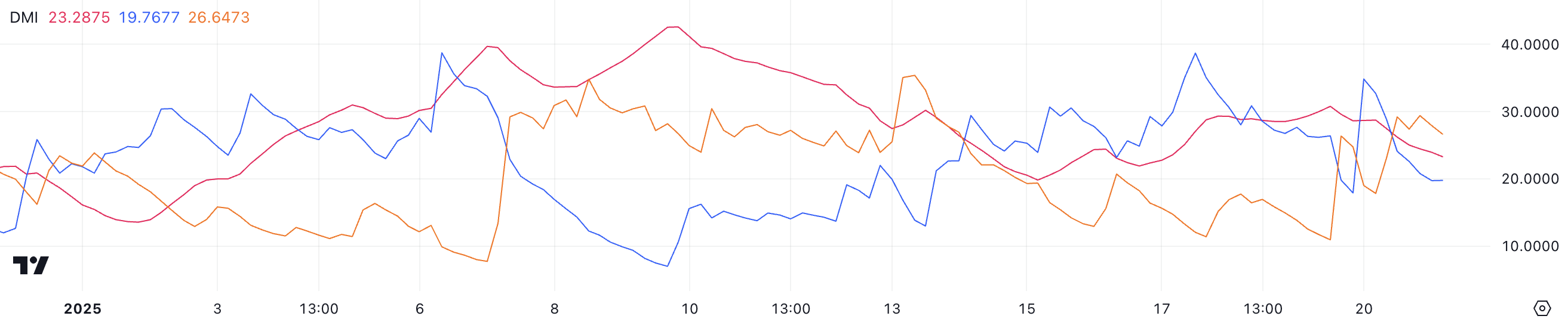 Bitcoin DMI-diagrammet afslører, at ADX er faldet til 23,2 fra 30,7 over de sidste to dage, hvilket fremhæver en svækkende trend. ADX måler trendstyrke, hvor værdier over 25 signalerer en stærk trend, og dem under 20 antyder mangel på retning.