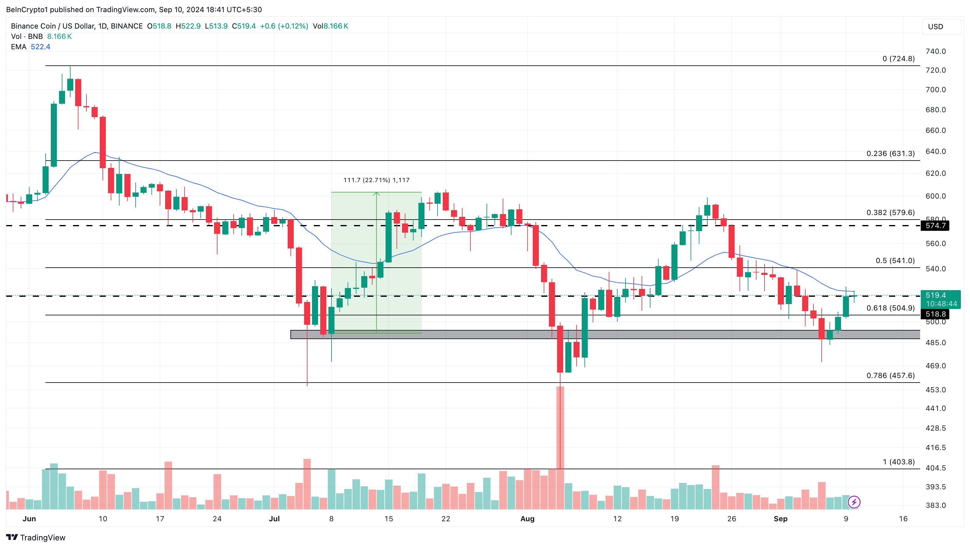 Ud fra det daglige diagram har BNB rystet det tidligere fald af sig og reboundet fra $487. Dette markante opsving antyder, at bulls aggressivt forsvarede støtten, hvilket var afgørende for coinens rally til $603 tilbage i juli.