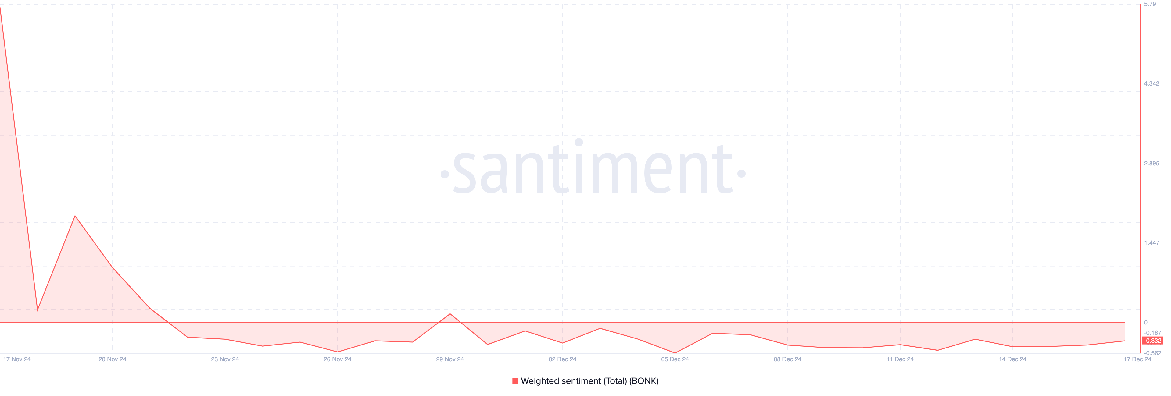 Data fra Santiment viser, at Solana meme coinen har forblevet i det negative område siden den 22. november. Denne vedvarende bearish stemning antyder, at meme coinens værdi kan fortsætte med at falde under de nuværende forhold.