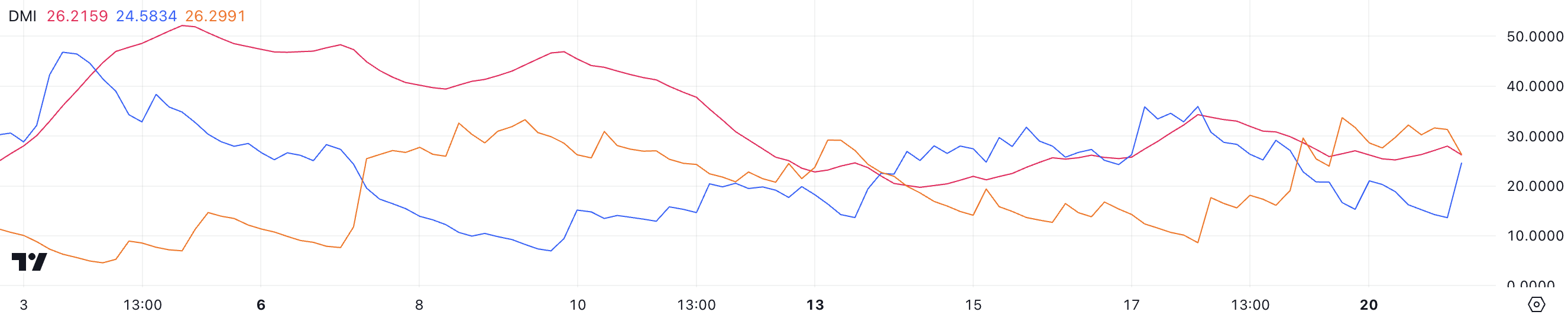 +DI er på 24,5, mens -DI er på 26,2, hvilket indikerer, at salgspres marginalt har overtaget købsmomentum, hvilket signalerer potentiel kortsigtet konsolidering eller korrektion.