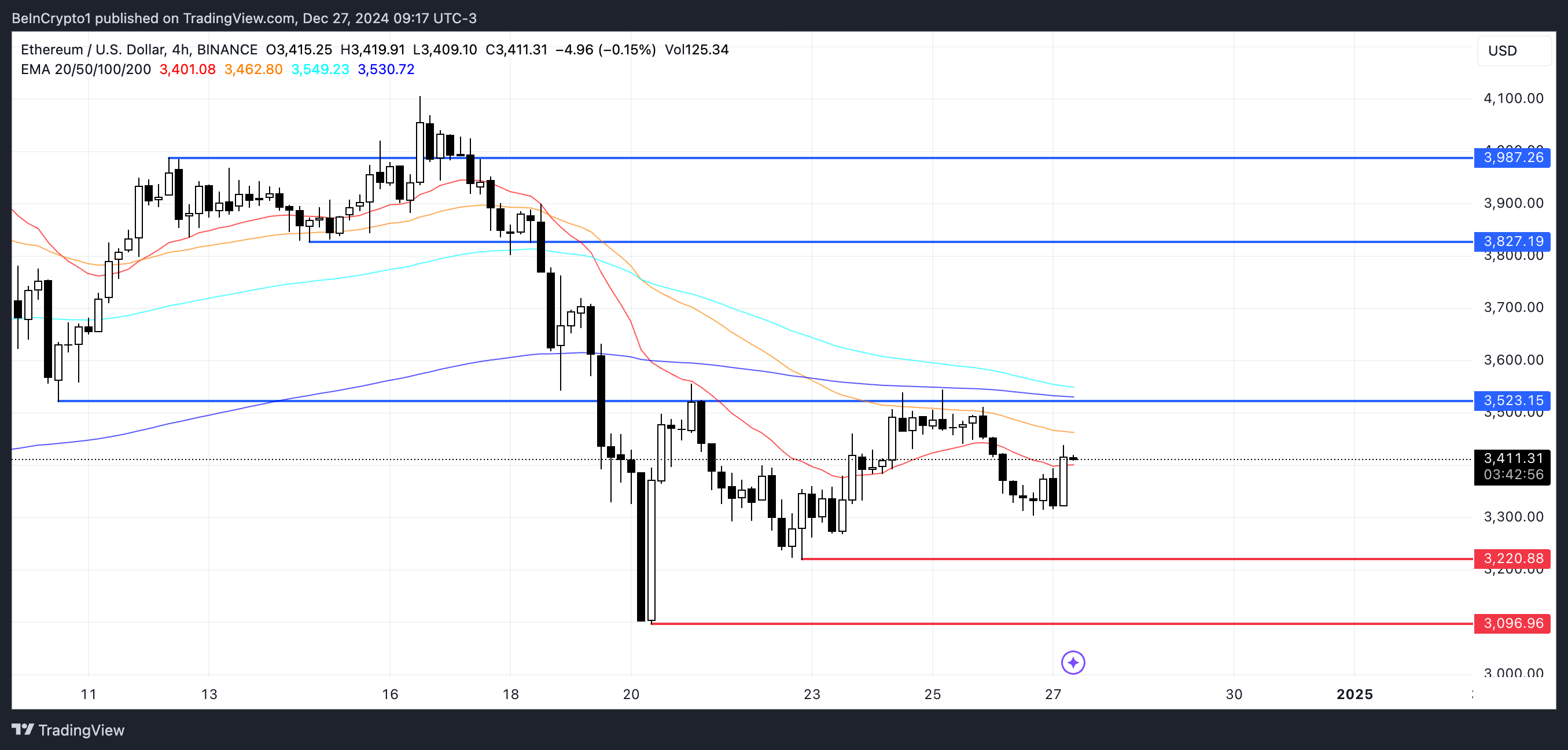 Ethereum kurs handles i øjeblikket inden for et interval, med modstand på $3.523 og støtte på $3.220. Dens EMA-linjer indikerer en nedadgående trend, med kortsigtede gennemsnit placeret under de langsigtede.