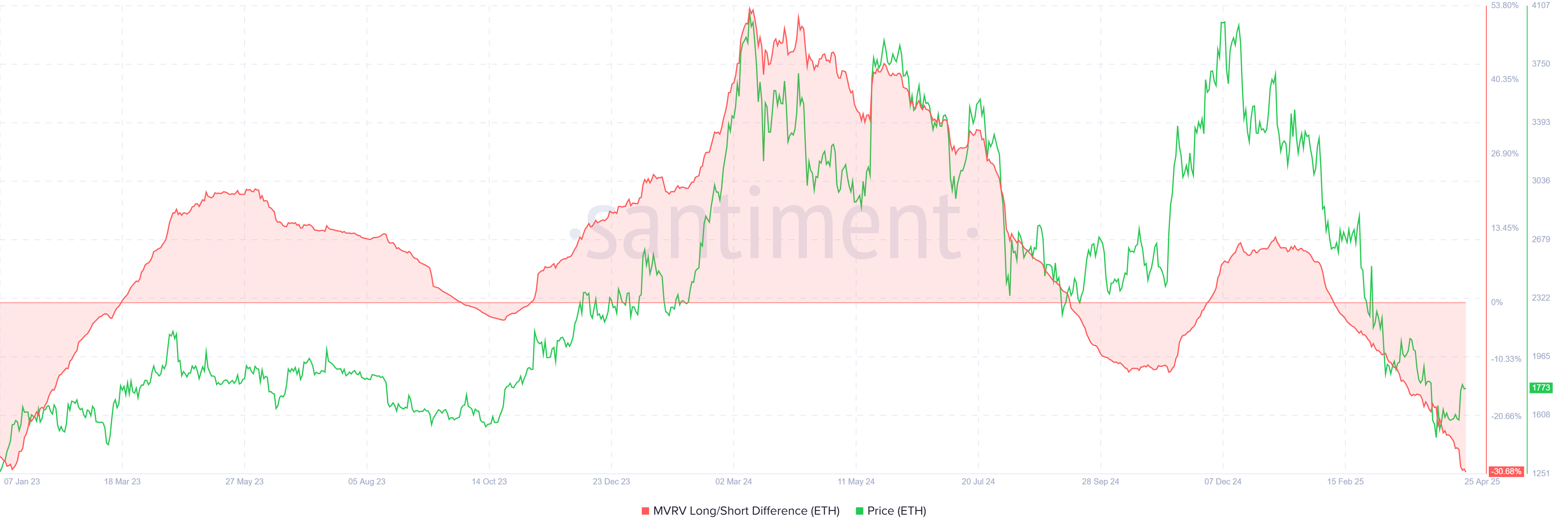I et bredere perspektiv præsenterer Ethereums makro momentum blandede signaler. Market Value to Realized Value (MVRV) Long/Short Difference indikatoren er i øjeblikket dybt negativ på -30%. Dette antyder, at markedet kan møde yderligere modstand i sine opsvingsforsøg.