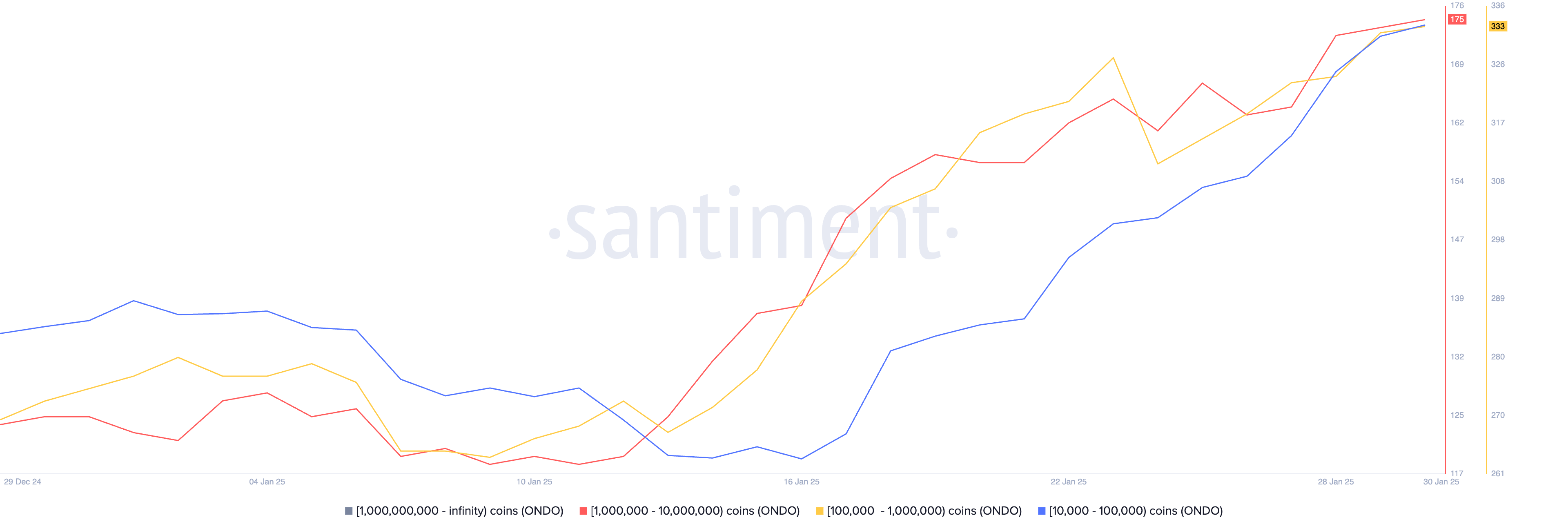 Kryptohvaler købte ONDO aggressivt over de sidste to uger. Adresser, der holder mellem 10.000 og 100.000 ONDO, steg fra 1.727 til 2.221, mens dem med 100.000 til 1.000.000 steg fra 289 til 332. Endnu større hvaler, der holder 1.000.000 til 10.000.000 ONDO, voksede fra 139 til 175.