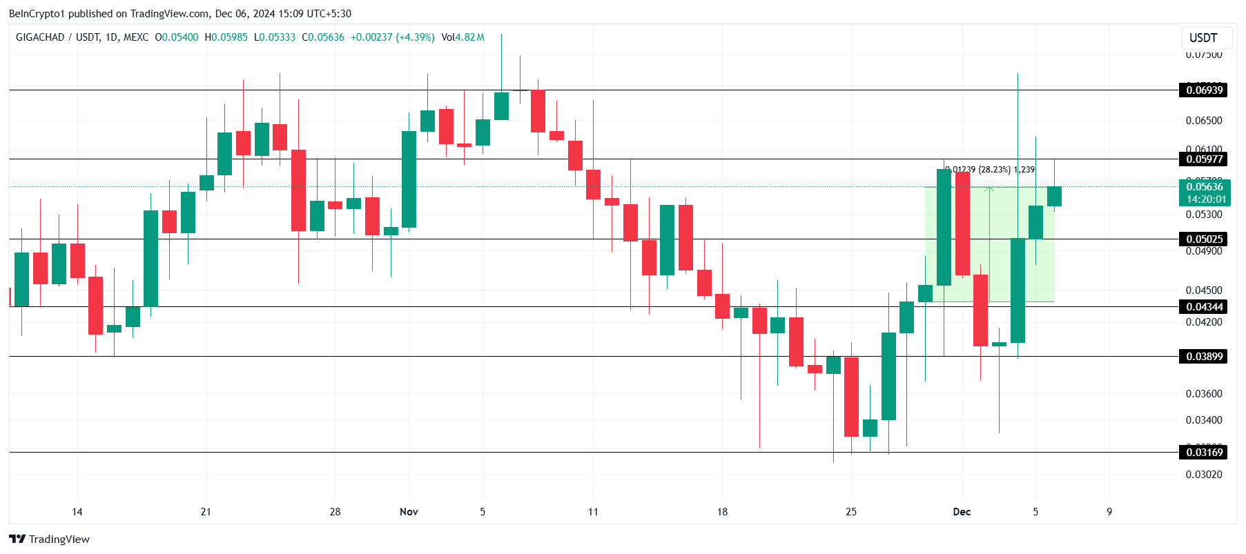 GIGA har opnået solide gevinster denne uge, med en stigning på 28% i de sidste syv dage. I øjeblikket værdisat til $0.0563, fortsætter meme coinen med at tiltrække investoropmærksomhed. Det nylige opsving fremhæver den voksende interesse for GIGA, hvilket positionerer den som en af de markante præstationer på markedet denne uge.