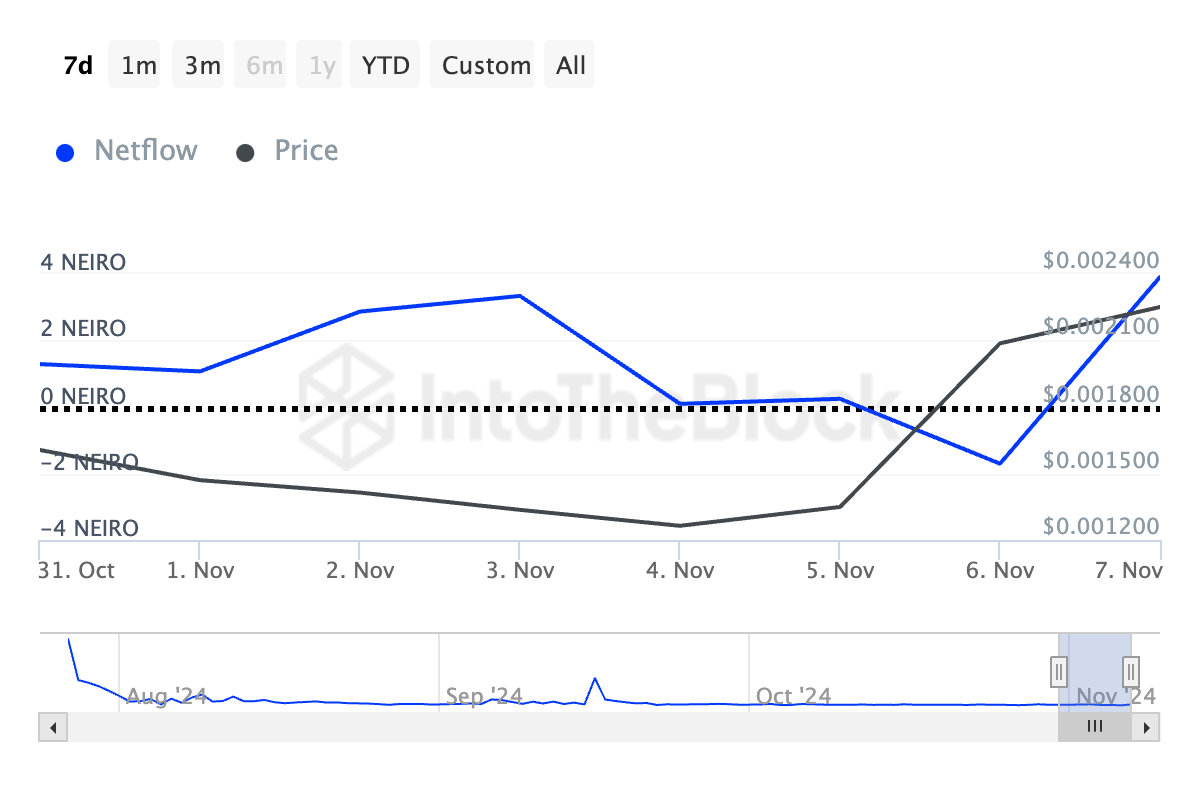 NEIRO’s hvaler eller store indehavere har vist tillid til dens vedvarende vækst ved at øge deres beholdninger i den seneste uge. IntoTheBlock’s data har afsløret en stigning på 266% i meme coinens store indehaveres netflow i de sidste syv dage.