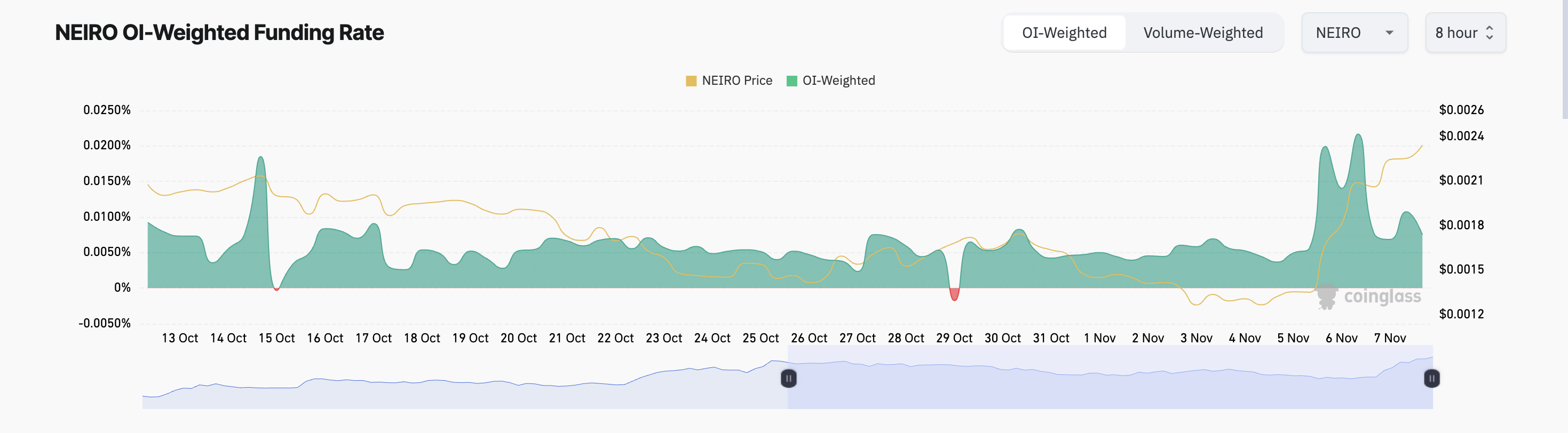 Desuden afspejler NEIRO’s positive finansieringsrate, som er på 0,0075% i øjeblikket, den bullish bias, som meme coinen aktuelt nyder godt af.