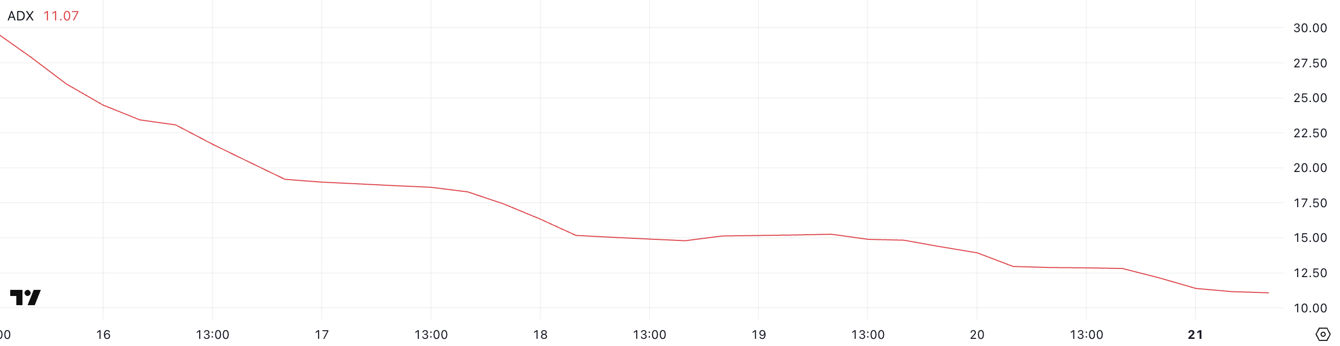 Onyxcoin’s Average Directional Index (ADX) er faldet til 11, ned fra 13,92 i går og 15,26 for to dage siden. Dette fald afspejler en konsekvent svækkelse i trendstyrken.