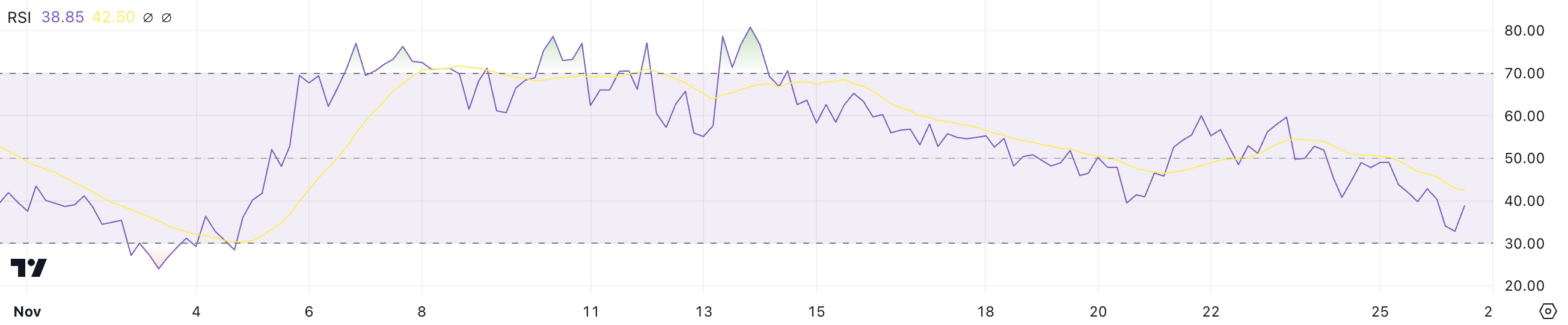 PEPE RSI er faldet til 38,8 fra 60 i de sidste tre dage, hvilket indikerer svækkende bullish momentum. RSI, eller Relative Strength Index, måler kursmomentum på en skala fra 0 til 100, hvor værdier over 70 signalerer overkøbte forhold og under 30 indikerer oversolgte niveauer.