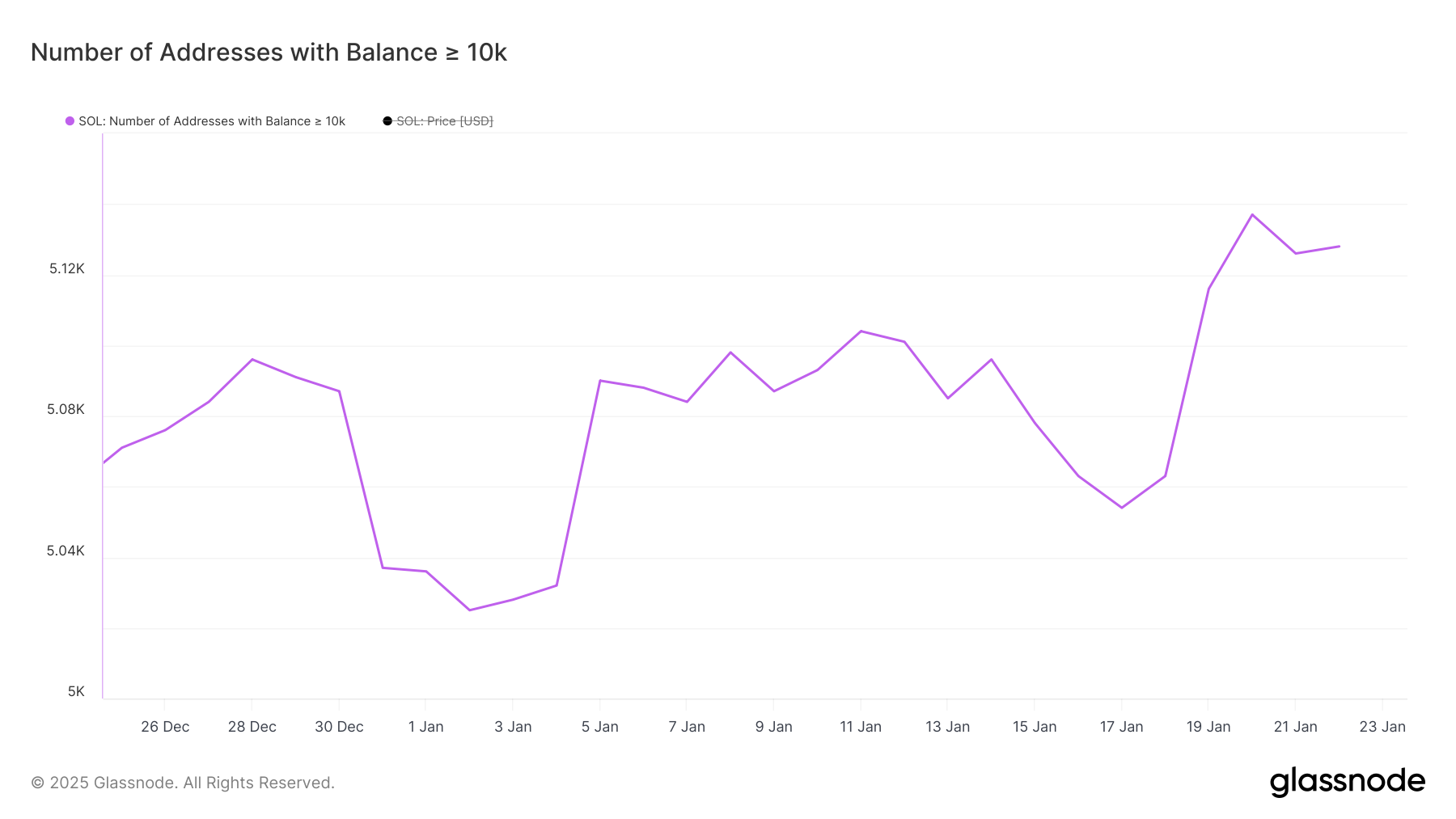 Solana hvaler har nået historiske niveauer, med adresser, der holder 10.000+ SOL, der toppede på 5.137 for tre dage siden, før de faldt en smule til 5.128.