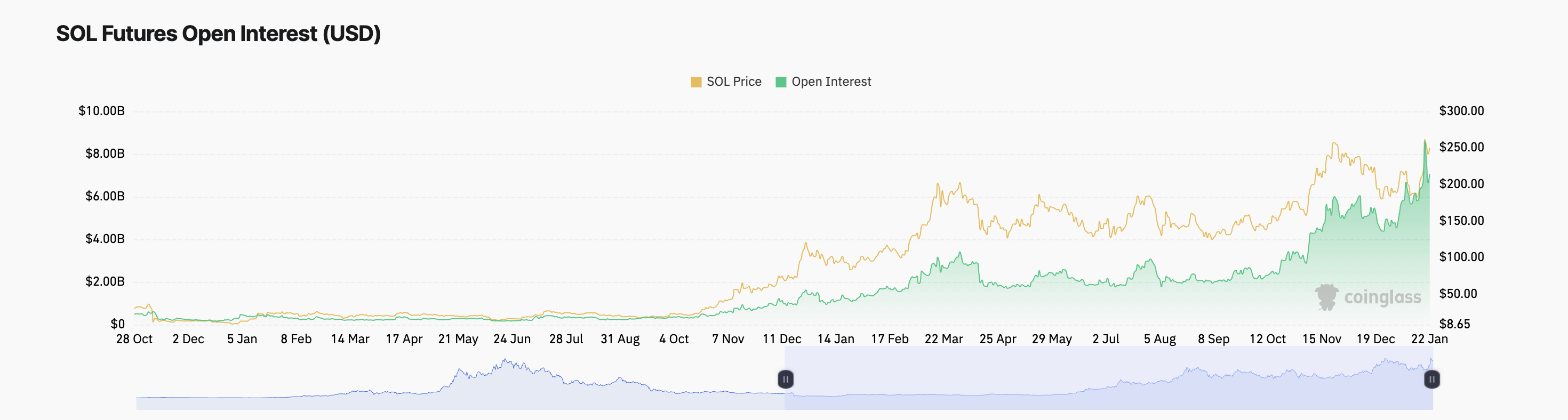 Solana (SOL) er faldet 14% fra sin rekordhøje kurs på $295,83, nået den 19. januar. På trods af faldet forbliver den bullish stemning stærk, da markedsdeltagere mindsker profittagning.