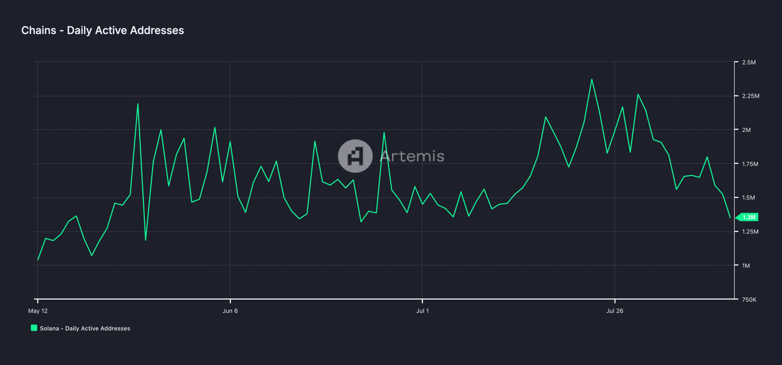 Faldet i DEX-volumen afspejler det generelle fald i brugeraktivitet på netværket. I løbet af den seneste uge er brugeraktiviteten styrtdykket. I den periode er det daglige antal adresser, der har gennemført mindst én transaktion på Solana, faldet med 19%.