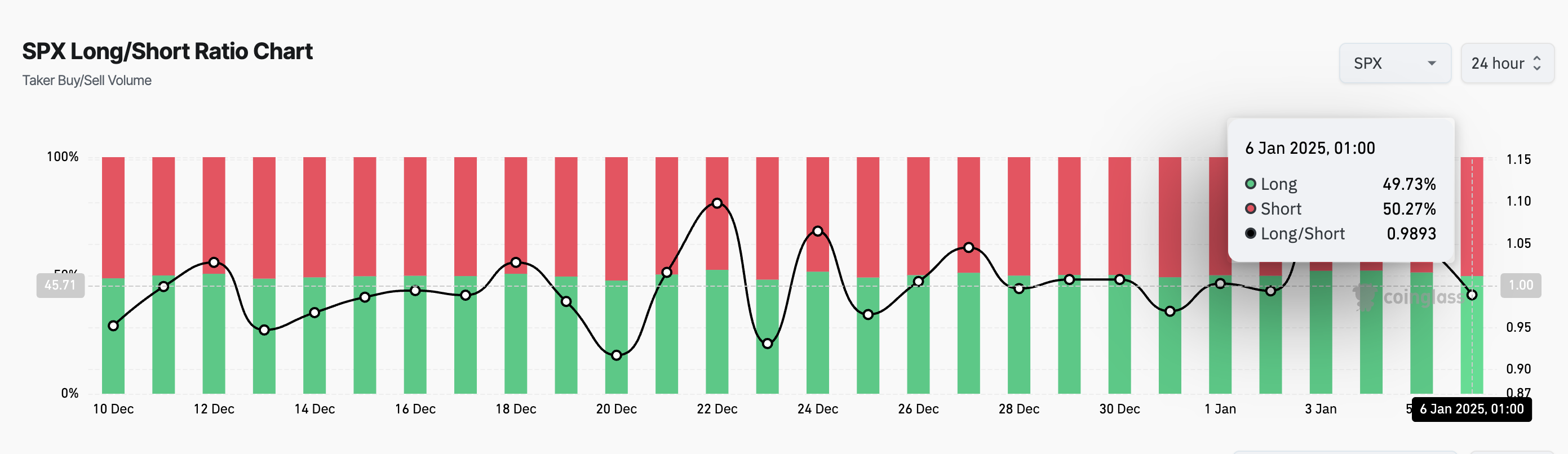 En aktivs Long/Short Ratio sammenligner antallet af dets long (købs) positioner med short (salgs) positioner på et marked. Som med SPX, når værdien er under én, satser flere handlende på, at kursen falder (shorting) frem for at stige. Hvis short-sælgere fortsætter med at dominere, kan det skabe nedadgående pres på kursen.