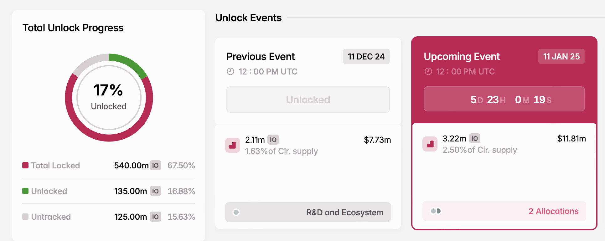 Den 11. januar er io.net planlagt til at låse op for cirka 3,22 millioner IO tokens, hvilket udgør omkring 2,50% af den cirkulerende forsyning. Disse tokens er allokeret til udvikling af fællesskab og økosystem.