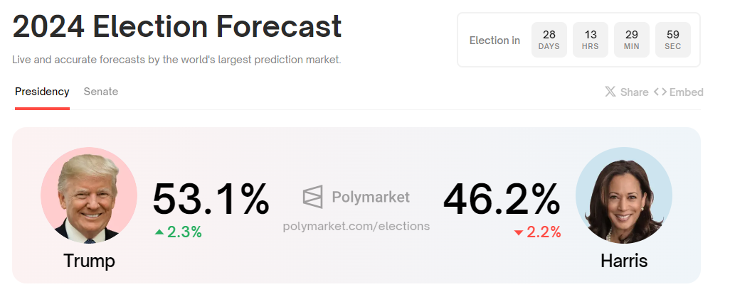 Donald Trump har taget føringen på Polymarket og udvider afstanden til Kamala Harris, mens nedtællingen til det amerikanske valg fortsætter. Med kun 28 dage tilbage fører den republikanske kandidat med 53,1% mod demokratens 46,2%.