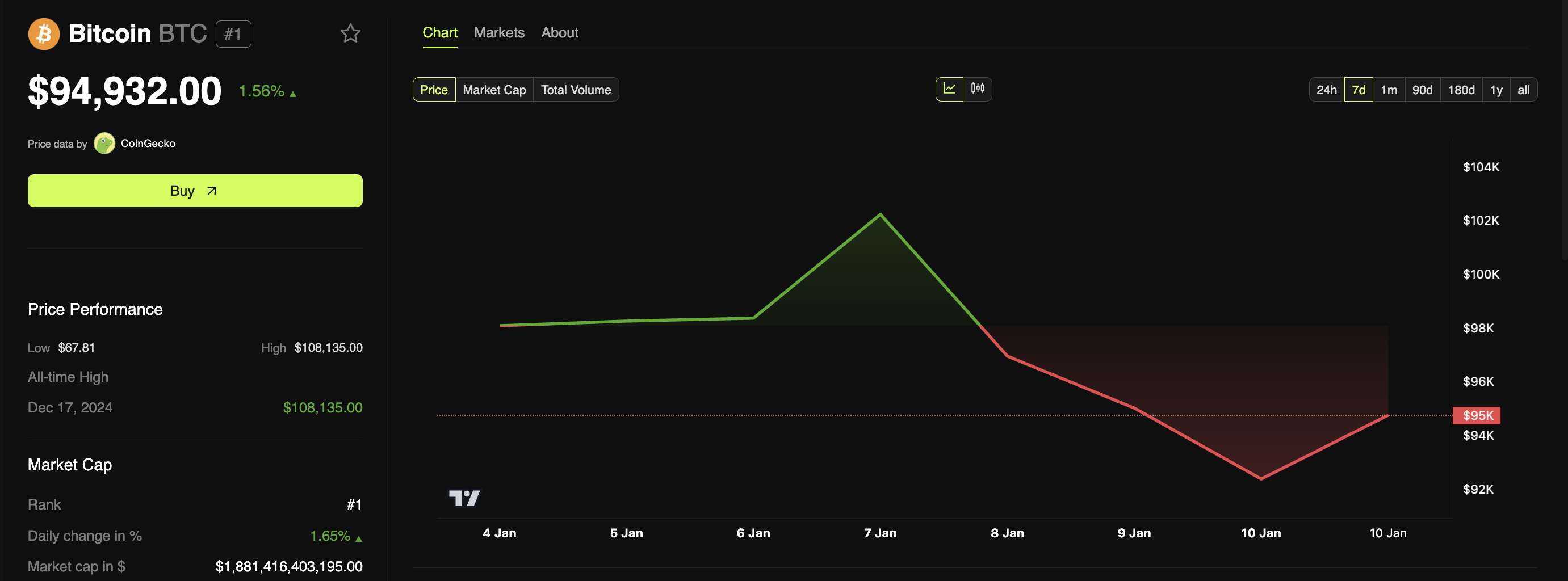 Ikke desto mindre faldt Bitcoins kurs i løbet af den sidste uge fra en top på $102.000 til så lavt som $92.000. I øjeblikket handles BTC til $94.932 efter en mindre genopretning.