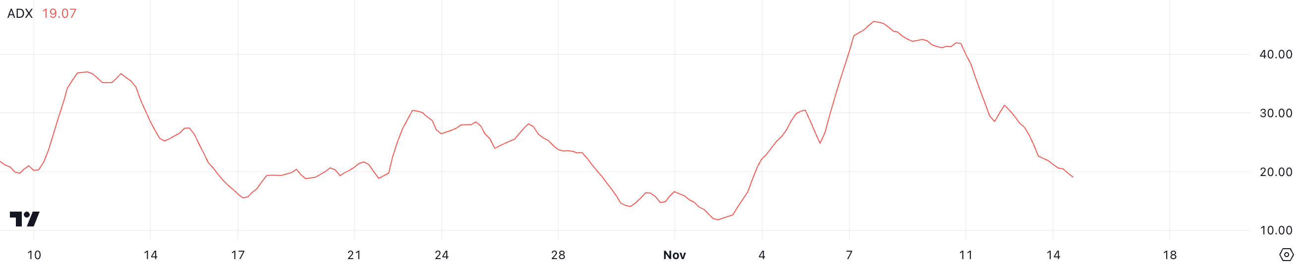 Typisk antyder en ADX-værdi over 25 en stærk tendens, mens værdier under 20 indikerer en mangel på tendens eller svagt momentum. Det skarpe fald fra over 40 til 19 signalerer, at styrken bag UNI’s nylige tendens er aftaget betydeligt.
