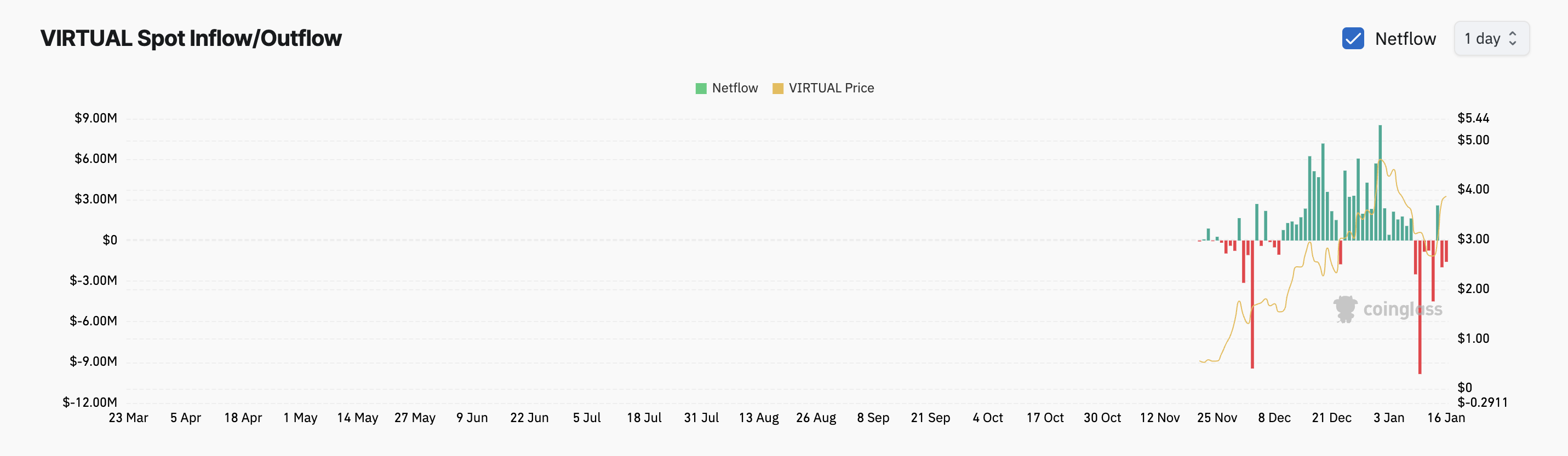 Men vedvarende udstrømninger fra spotmarkedet de sidste to dage vækker bekymring. Ifølge Coinglass har VIRTUAL’s spotmarked oplevet udstrømninger på $4 millioner i denne periode, hvilket indikerer salg.