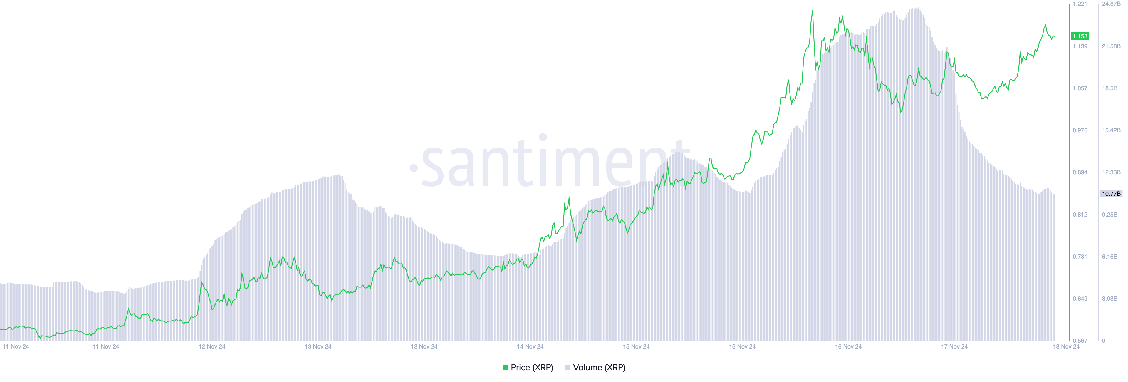 Ripples XRP steg til et treårigt højdepunkt på $1,26 den 16. november, men er siden faldet tilbage til $1,15, hvilket afspejler et fald på 9% over de seneste to dage.
