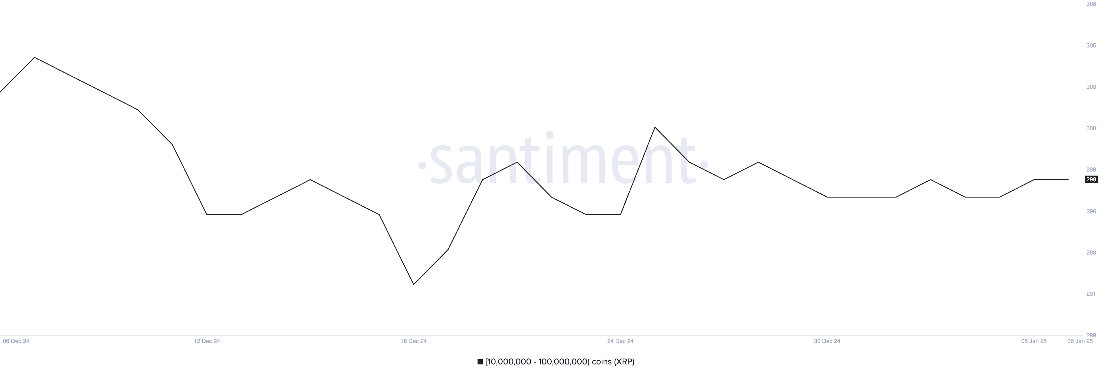 Antallet af XRP-hvaler, der holder mellem 10 millioner og 100 millioner coins, har vist betydelige udsving for nylig. Efter at have nået et måneds-højdepunkt på 305 den 7. december, faldt antallet kraftigt til et måneds-lavpunkt på 292 den 18. december.