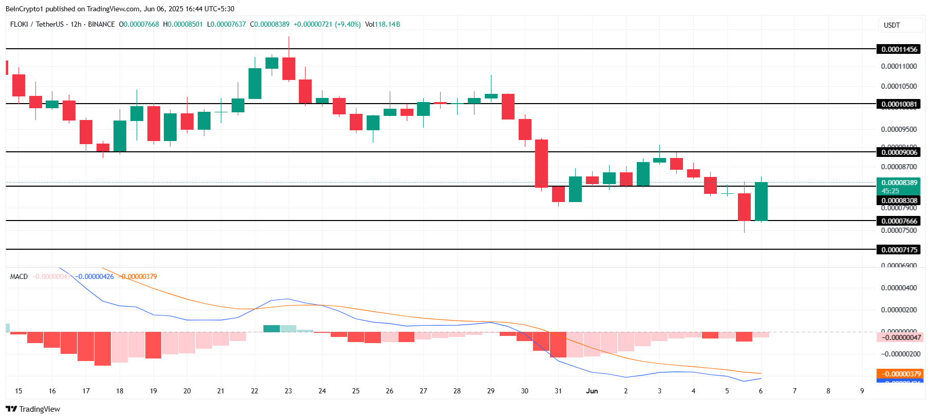 FLOKI steg 9,4% i dag, med en kurs på $0,00008389. Altcoinen sigter mod at sikre $0,00008308 som et afgørende støtteniveau, hvilket kan hjælpe den med at nå $0,00009006 i den nærmeste fremtid. Støtten ved $0,00008308 vil være essentiel for at bestemme FLOKI’s evne til at fortsætte sin opadgående bevægelse.