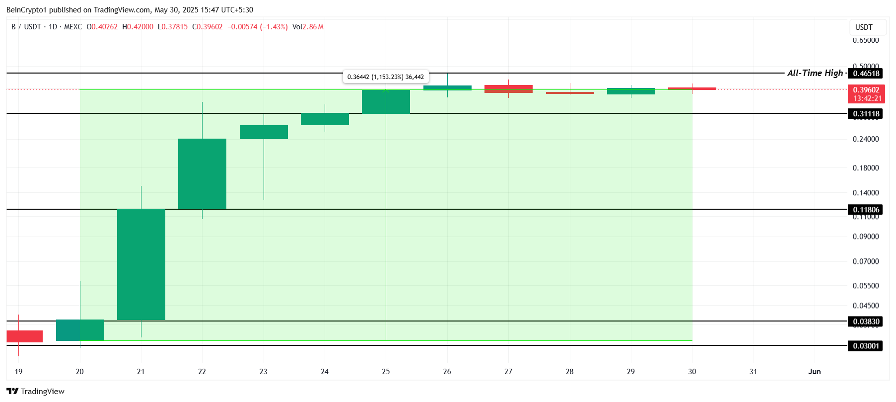 Givet dens ekstraordinære stigning er B klar til yderligere gevinster. Hvis bullish momentum fortsætter, tiltrækker flere købere og driver kursstigninger, synes en ny rekordhøj over $0,465 opnåelig.