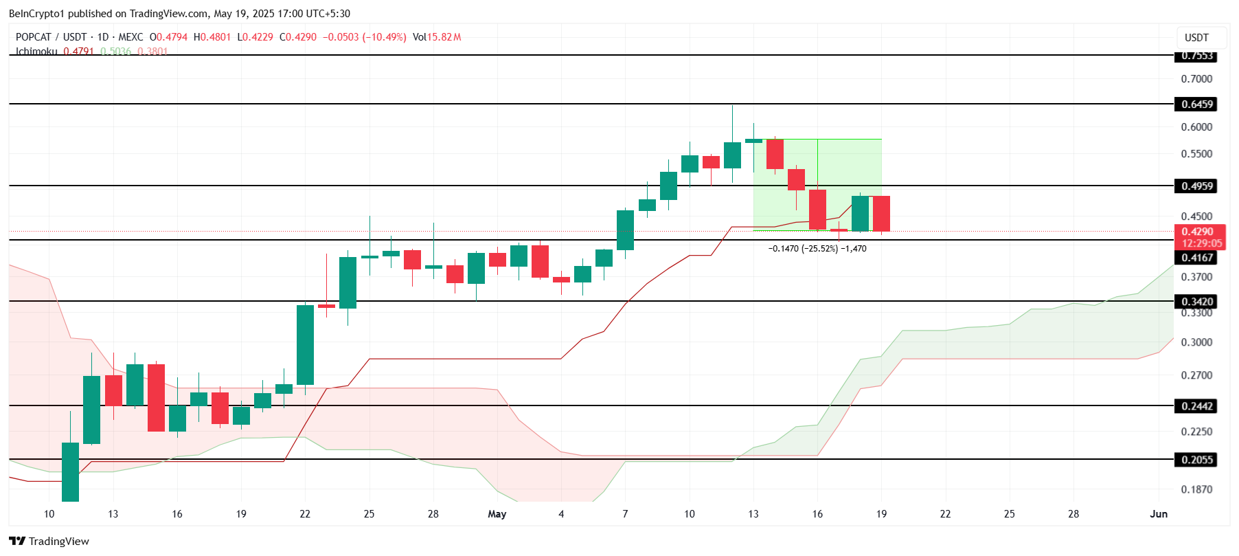 Tegn på fortsat vækst er synlige, med Ichimoku Cloud placeret under lysestagerne, hvilket signalerer bullish momentum. Dette tekniske mønster antyder, at POPCAT kan genvinde $0.495 som støtte, hvilket baner vejen for yderligere kursstigninger. Markedsforholdene ser gunstige ud for coinens fortsatte opadgående kurs.
