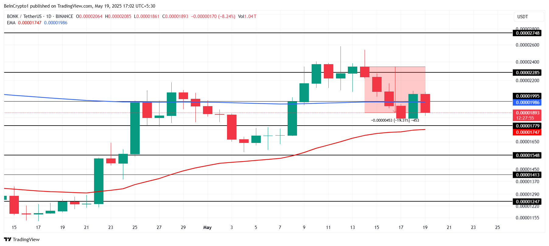 Men hvis usikre investorer vælger at sælge tidligt, kan det lægge nedadgående pres på BONK’s kurs. Et fald under støtten på $0.00001779 ville indikere bearish momentum, hvilket potentielt kan sende kursen ned til $0.00001548. Dette ville ugyldiggøre det optimistiske scenarie og underminere potentialet for en stigning.