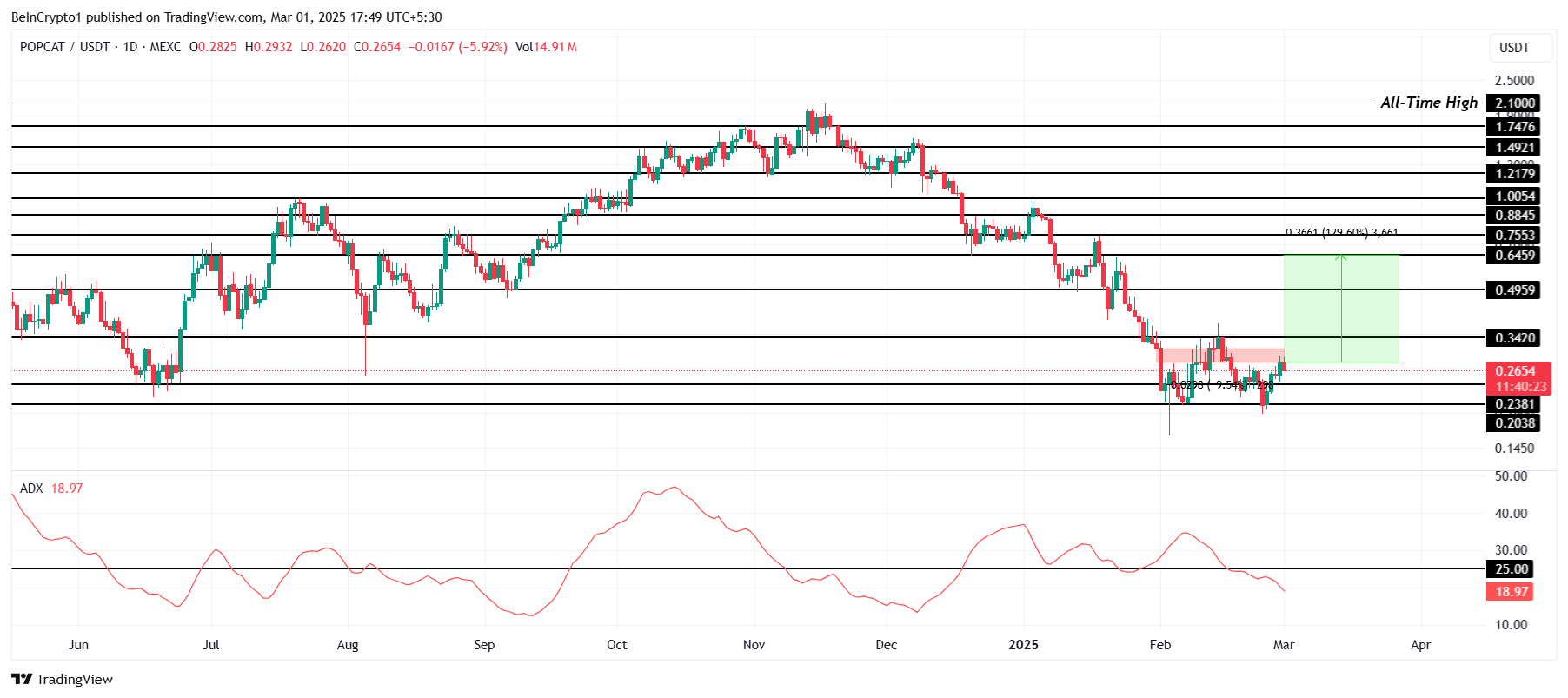 I tidligere markedscyklusser har et opsving fra $0.238 støtten, kombineret med bullish signaler, drevet stigninger op til $0.645. ADX ligger i øjeblikket under 25.0 grænsen, hvilket indikerer svækkende bearish momentum.
