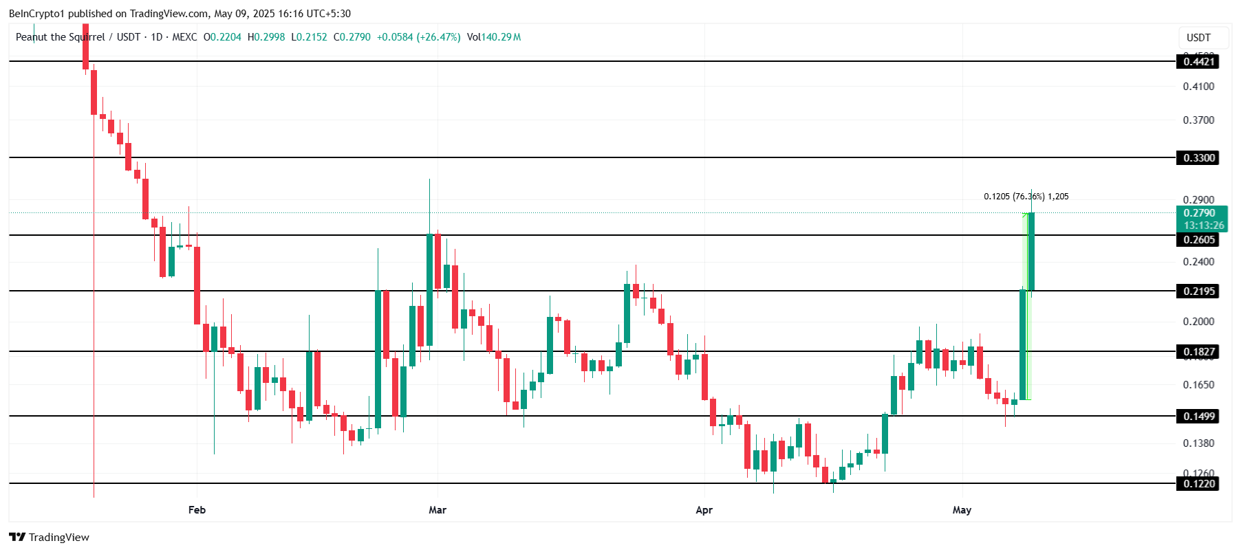 PNUT har vist sig som en af de bedst præsterende coins i dag, med en stigning på 76% til at nå et 2-måneders højdepunkt. Med en kurs på $0,279 står meme coinen over for den kritiske støtte på $0,260. At sikre denne støtte er afgørende for at bevare de seneste gevinster og bane vejen for yderligere vækst.
