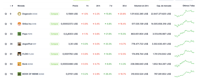 Markedsværdien af meme-mønter ligger på 54,639 milliarder dollars og har oplevet et dagligt fald på 2,7 %. Dette fald afspejles i deres handelsvolumen, som er rapporteret til 5 milliarder dollars i løbet af de sidste 24 timer.