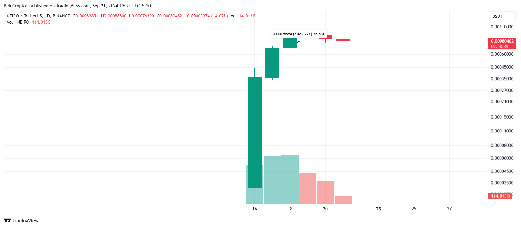 Ulig Neiro Ethereum, som handles til $0.086, skifter Første Neiro på Ethereum hænder til $0.000804. Men, opsvinget for den sidstnævnte kan være kortvarigt, da den samlede handelsvolumen er faldet med 117% på bare 72 timer.