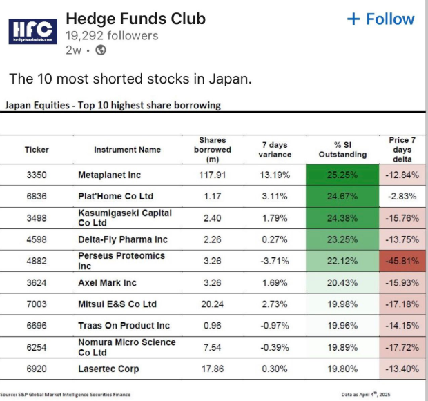 Metaplanet, det Tokyo-noterede firma, der steg over 5.000% i 2024 efter sin dristige Bitcoin-treasury-strategi, er nu den mest shortede aktie i Japan, ifølge sin direktør.