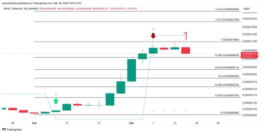Desuden har Tom Demark (TD) Sequential indicator blinket et salgssignal på PEPE’s tre-dages diagram, hvilket tyder på potentiel profit-taking og en efterfølgende priskorrektion. Det tyder på, at PEPE kan opleve en nedgang til $0,00000629 eller endda $0,00000411.