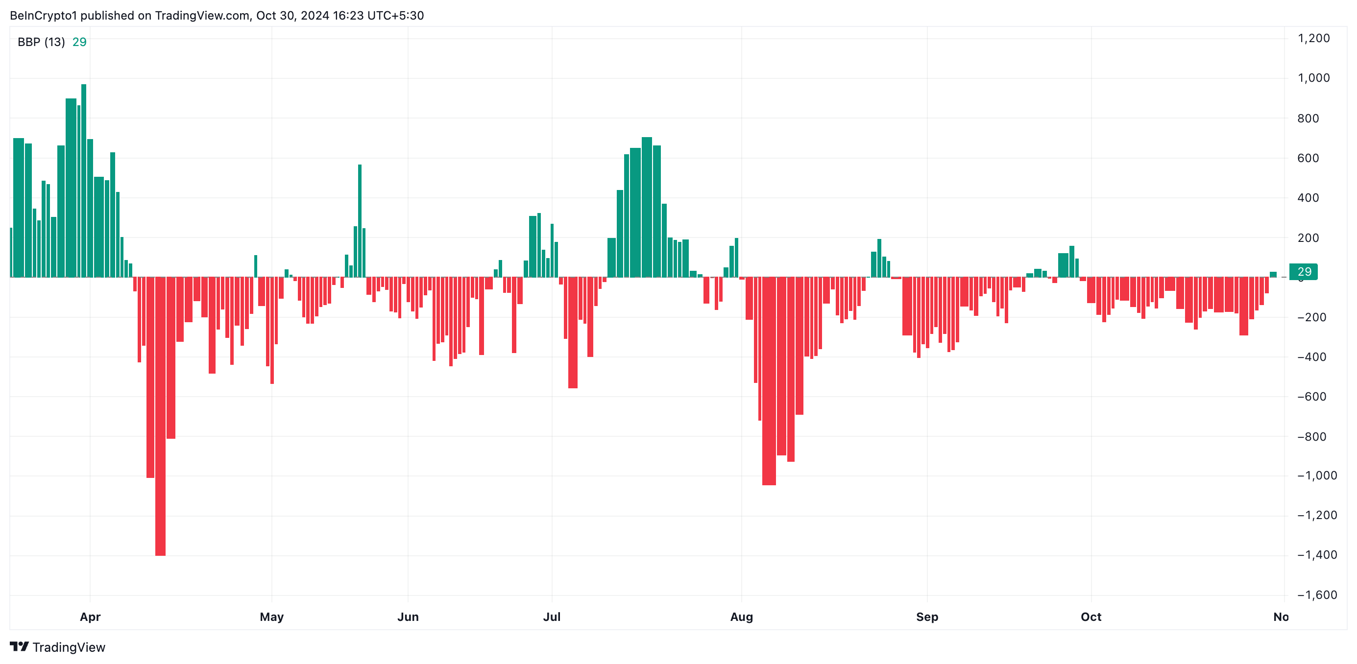 Dette målingsværktøj vurderer markedsmomentum ved at sammenligne styrken af købere og sælgere. En overvejende negativ aflæsning afspejler svag køberaktivitet. Det antyder, at købere ikke kan skubbe priserne over nylige højder, hvilket indikerer en mangel på efterspørgsel eller tillid på markedet.