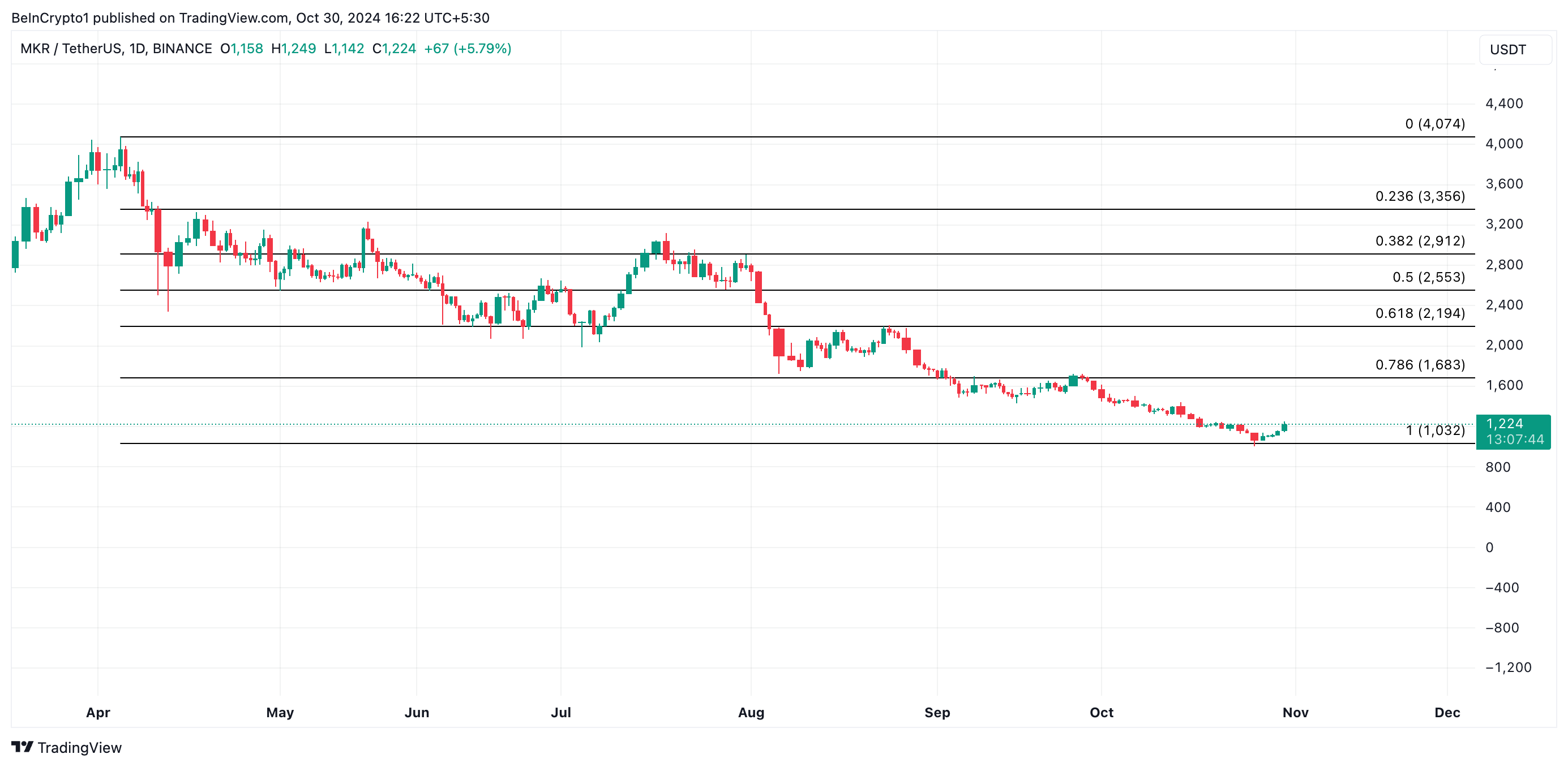 MKR handles til $1,224, efter et opsving fra sit støtteniveau på $1,032 efter et 10% opsving i de seneste dage. Fibonacci Retracement-niveauer antyder, at det næste kursmål er $1,683, et nøglemodstandspunkt.