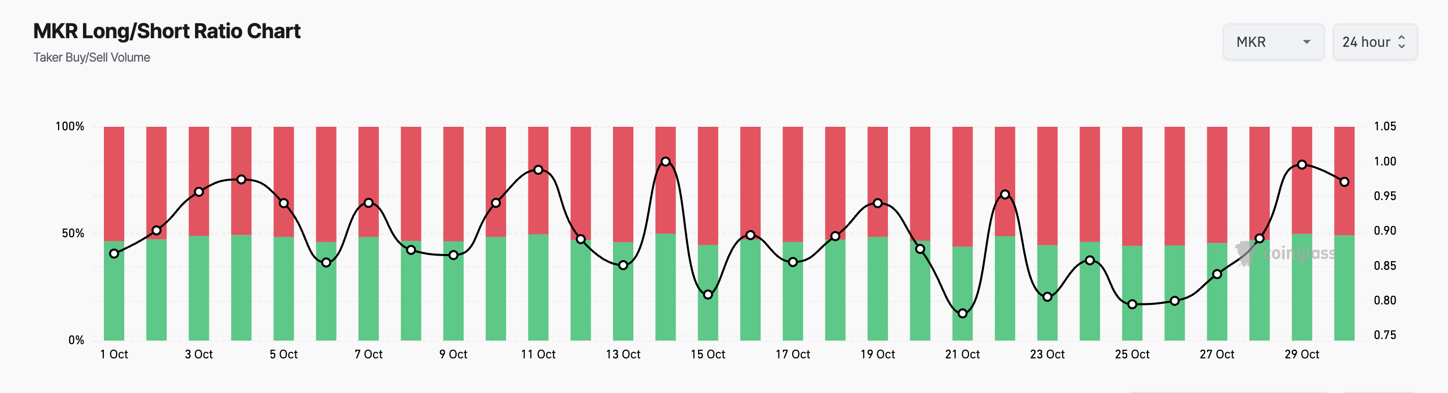 Ifølge Coinglass har MKRs long/short-forhold nået en månedlig højde, hvor næsten 50% af volumen nu domineres af lange positioner. I løbet af de sidste 24 timer har MKRs lange volumen udgjort $42,07 milliarder.