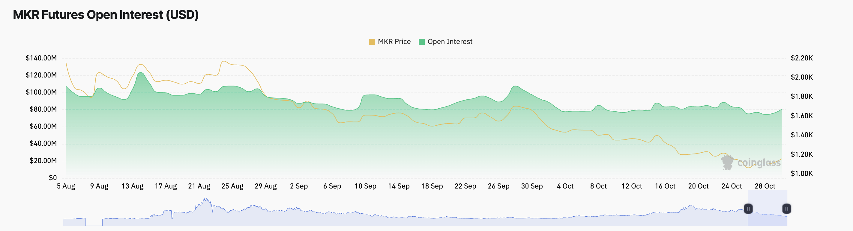 MKRs faldende Open Interest afspejler manglen på tillid. I øjeblikket står tokenets open interest på $81 millioner, hvilket er et fald på 12% siden månedens begyndelse.