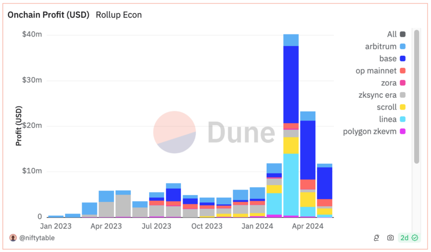 Base fører også i fortjeneste. I løbet af de sidste tre måneder har platformen ifølge Dune Analytics genereret det højeste overskud på kæden, herunder en rekord på 16,9 millioner dollars i marts. Selv om overskuddet faldt med 58,6 % til 6,98 millioner dollars i maj, var Base stadig langt foran Optimism, som kun tjente 1,57 millioner dollars i samme periode.