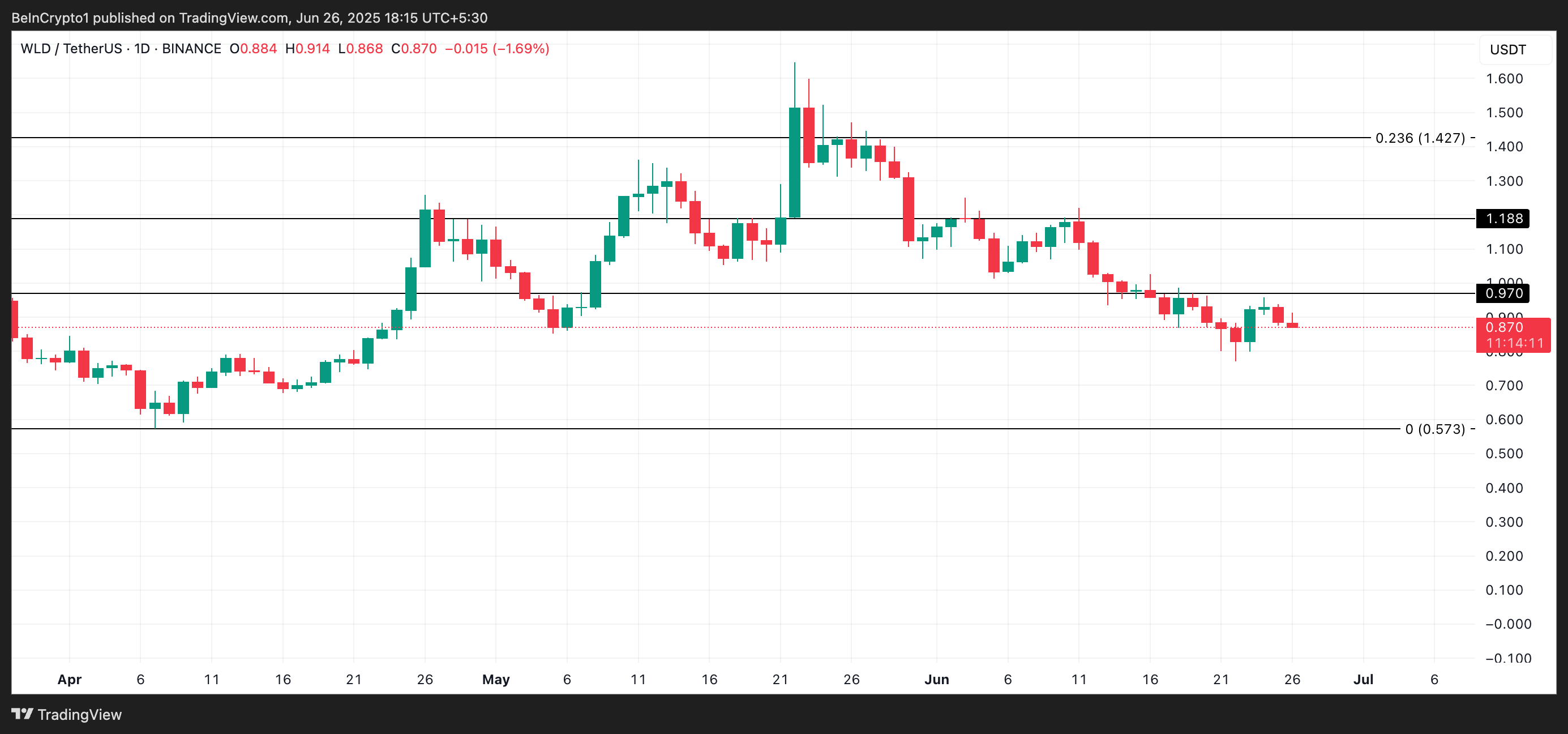 De cirkulerende nyheder har bidraget til et mildt opsving i WLD tokenets kurs. Hvis købspresset fortsætter med at bygge op, kan WLD bryde over $0,97 modstandsniveauet.