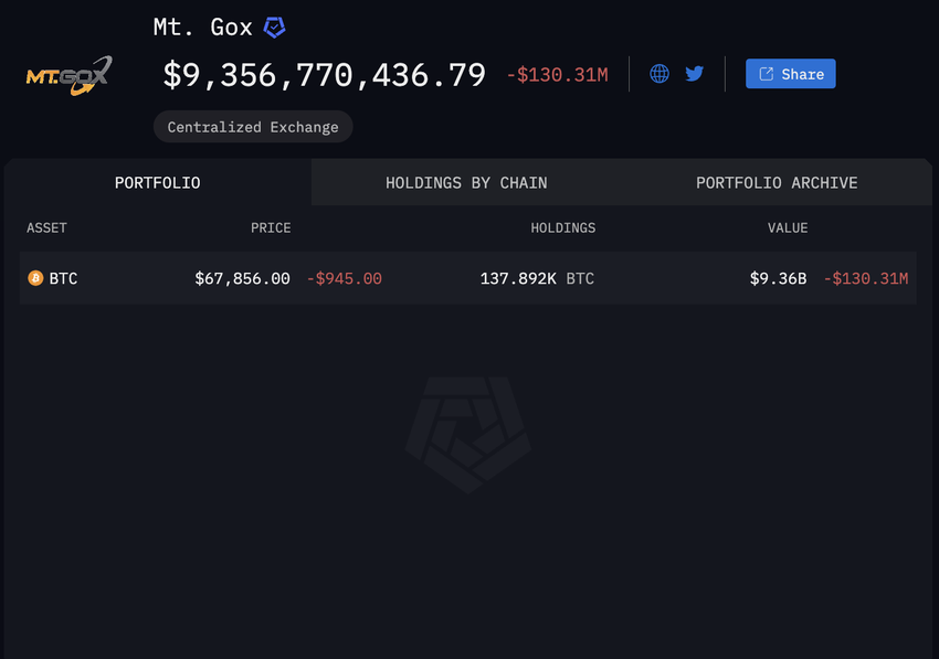 På trods af den store overførsel bevarer Mt. Gox-walleten BTC-aktiver til en værdi af omkring 9,3 milliarder dollars.