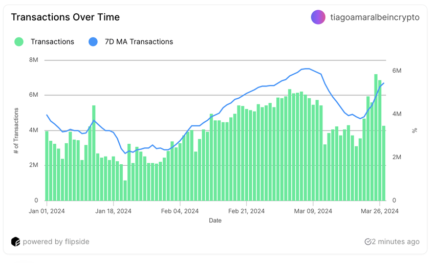 I denne fase gik NEAR-prisen fra $ 5,96 til $ 6,44, hvilket indikerer en mild opadgående tendens midt i svingende transaktionsvolumen. Det er bemærkelsesværdigt, at antallet af transaktioner efter den 20. marts oplevede en betydelig stigning. Tallet nåede op på 6,8 millioner den 26. marts, hvilket er det højeste niveau siden december 2023.